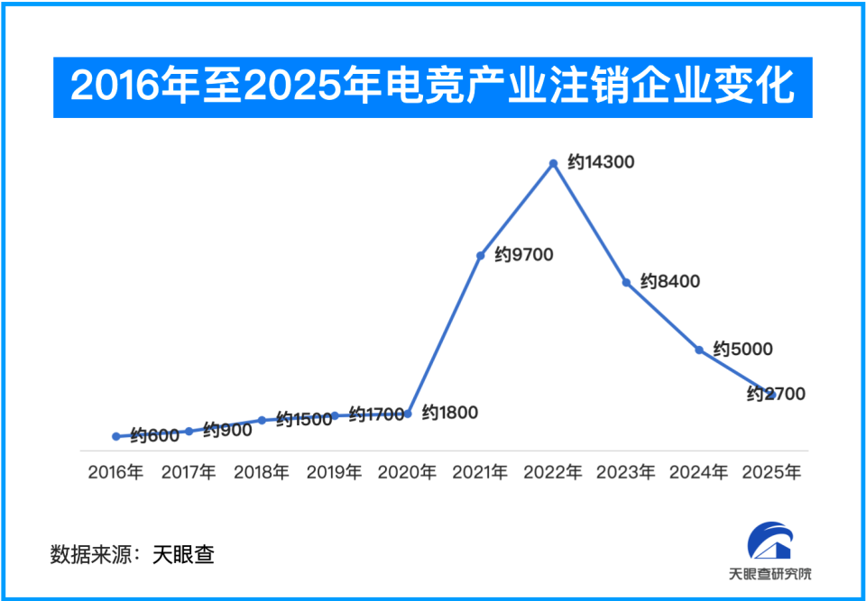 天眼查数据显示,2021年至2025年间,全国共有超过4万家企业名称或经营范围涉及电子竞技、电竞、网络竞技、互联网竞技的企业,遭遇了清算、停业、吊销或注销的结局。