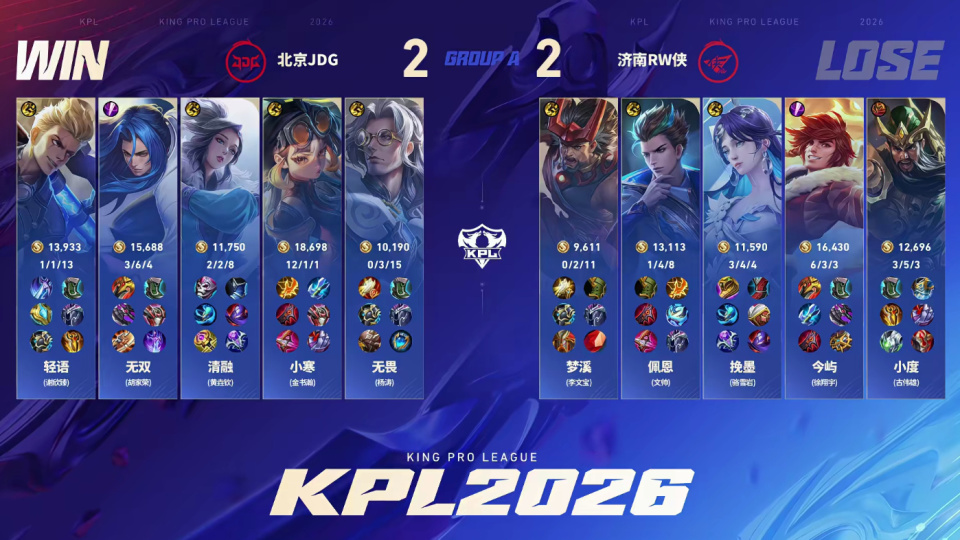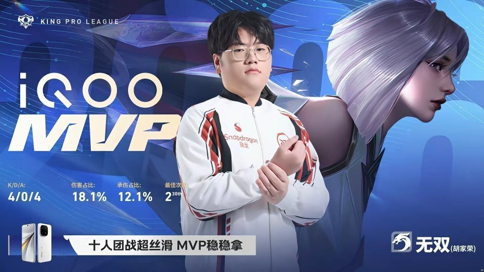 双方打到后期经济基本持平,无双拿到龙之后,JDG全员追击。镜换位之后大招直接锁到残血戈娅完成收割,回头刚好击杀不知火舞,橘右京复活站起来之后,无双配合轻语守尸,拿了一波三杀,这局无双也成功拿到了MVP。