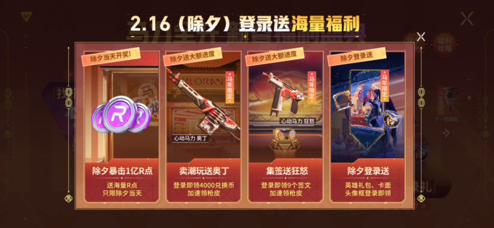 除夕狂欢夜:总值1亿R点的奖池开放,登录即可参与暴击抽奖,另含春节限定称号、卡面、头像框、限时狂徒皮肤及英雄自选礼包。