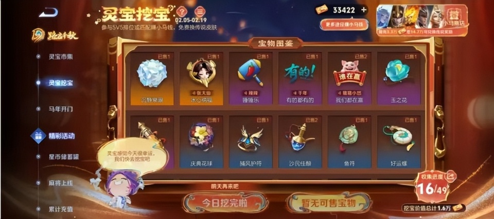 玩家不用怎么肝灵宝市集和灵宝挖宝这两个活动,都可以保底获得15万小马钱。那么这15万小马钱怎么来呢?首先就是2月15日和2月16日登录必得10万小马钱。其次是打排位,匹配,人机模式能挖到云中蝶这个宝物也可以获得5万小马钱,因此,保底可以获得15万小马钱。云中蝶只能挖出一个。