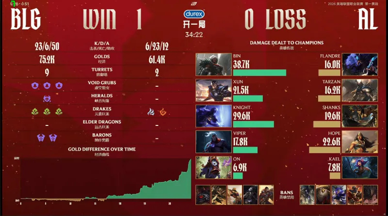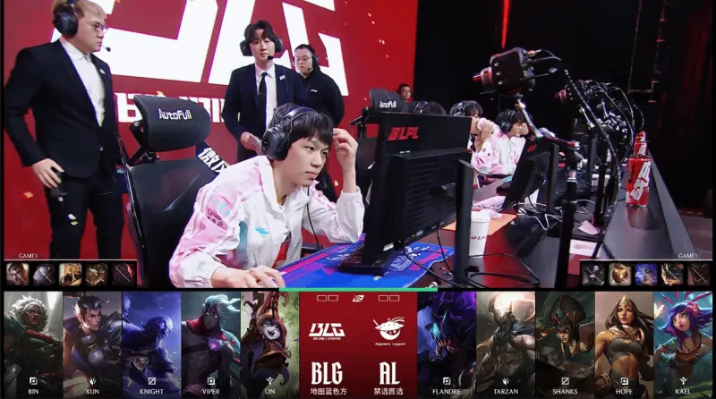 第一局比赛,BLG蓝色方,禁用:杰斯;发条;沙皇;鳄鱼;塞恩,选用:Bin狼母;Xun赵信;Knight瑞兹;Viper韦鲁斯;ON露露;AL红色方,禁用:石头人;兰博;芸阿娜;巴德;牛头,选用:Flandre雷克赛;Tarzan潘森;Shanks蛇女;Hope希维尔;Kael妮蔻