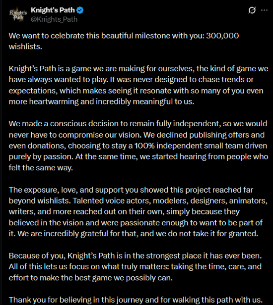 正是因为你们,《Knight’s Path》才得以站在有史以来最稳固的位置。这一切让我们能够专注于真正重要的事情:投入足够的时间、耐心与心血,去打磨一款我们所能做到的、最好的游戏。感谢你们相信这段旅程,也感谢你们愿意与我们一同走在这条道路上。