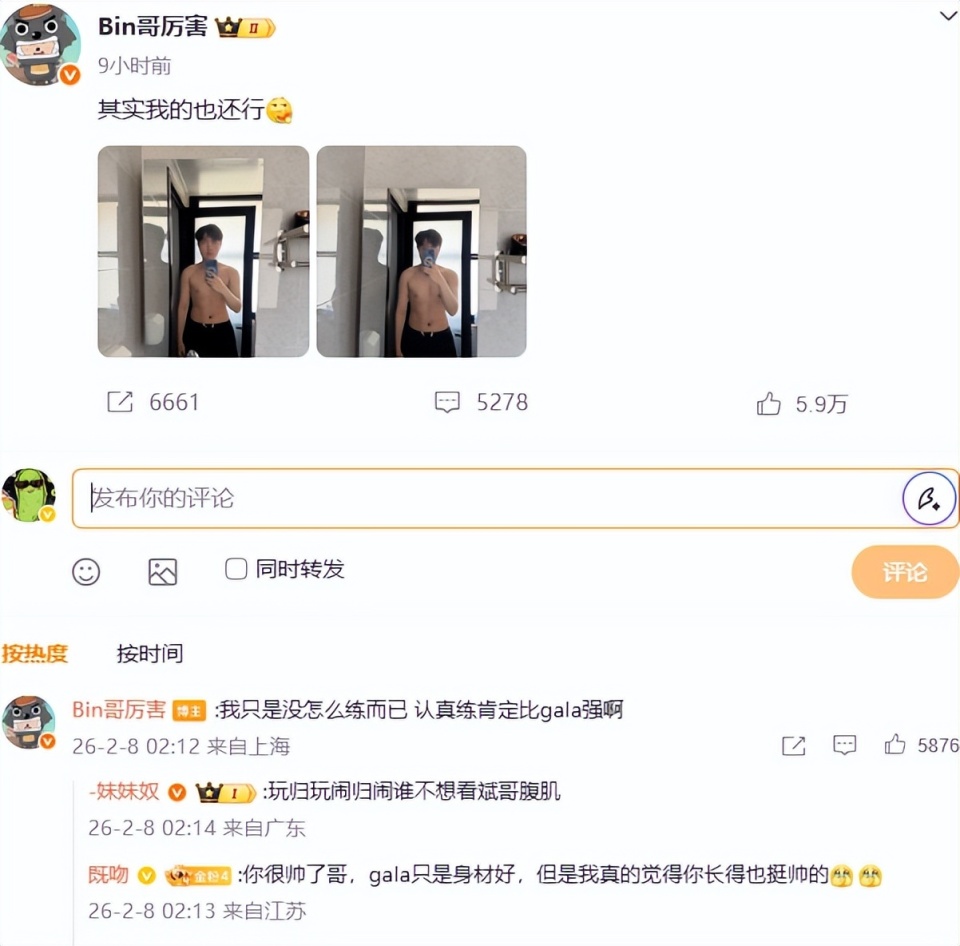 Gala秀八块腹肌之后,Bin也不认输,凌晨晒出自己的一块腹肌