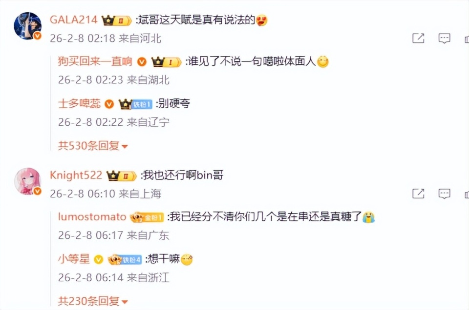 对于Bin的这波晒照,Gala还进行了回复,夸奖Bin是有天赋的。除了说Gala人真好之外,还能说什么呢,这都要夸Bin大哥,可以的,难怪和队友们关系都很好。