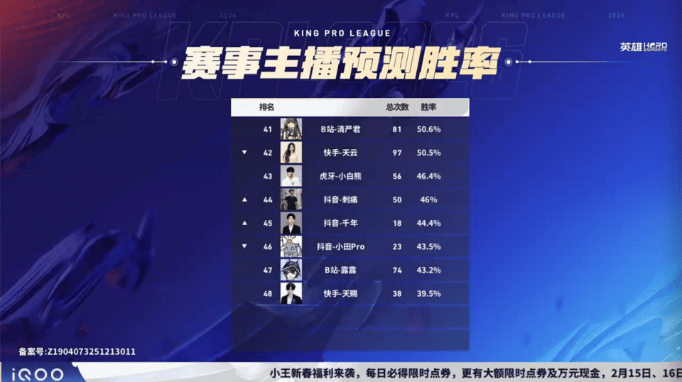 快手-灵儿胜率65.4%,位于排行榜第一。