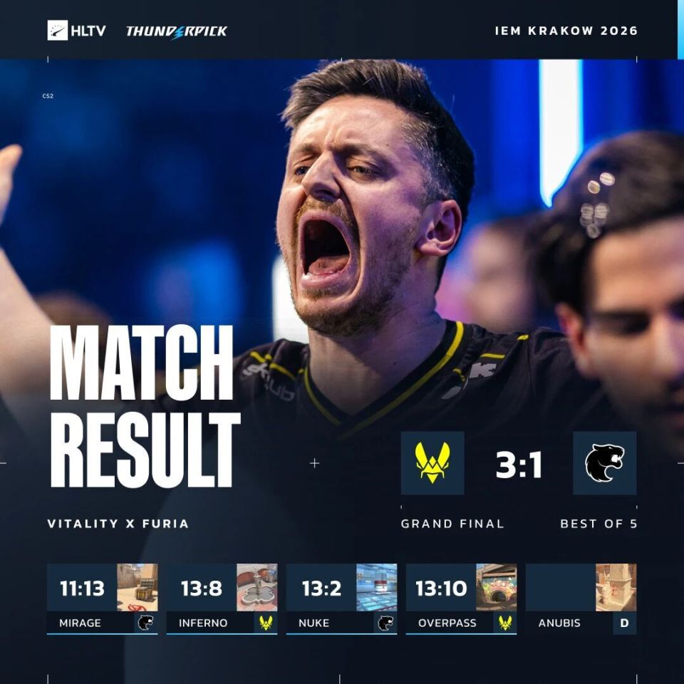 决赛:Vitality 3-1 FURIA,获得冠军!