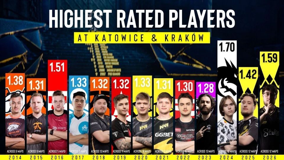 ZywOo在波兰赛事打出了1.59 rating,比他之前在EPL S19的巅峰高出0.00015,使得IEM克拉科夫成为他职业生涯中rating最高的大型赛事。