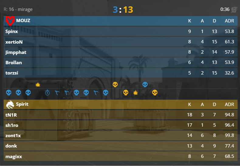 来到图二Mirage,tN1R的手感依旧火热,zont1x不仅化身B小雷神,也能单B三杀。torzsi研发i9,MOUZ进攻仅拿两分。换边绿龙再拿手枪局,一波碾压终结比赛。