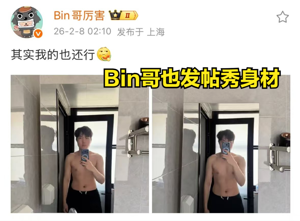 继“周淑怡谈Gala秀腹肌:打破了我对选手身材管理的认知”后,Bin哥好胜心也上来了,发贴“其实我的也还行”