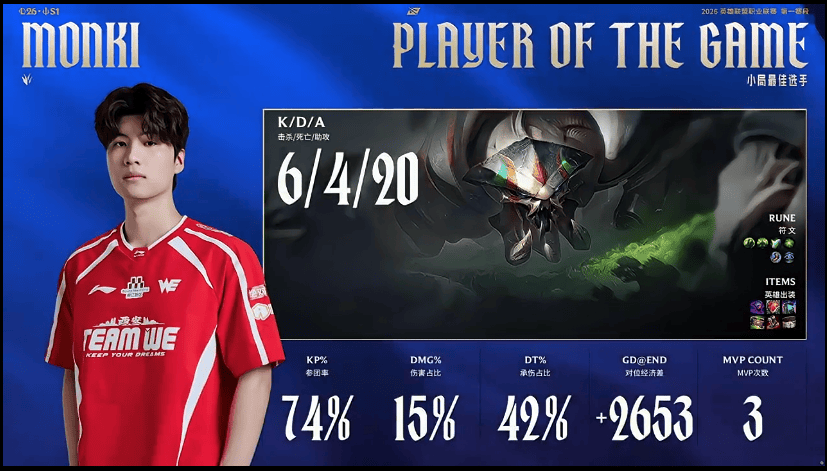 Monki使用蝎子打出6/4/20战绩,斩获WE对阵TES第一局MVP