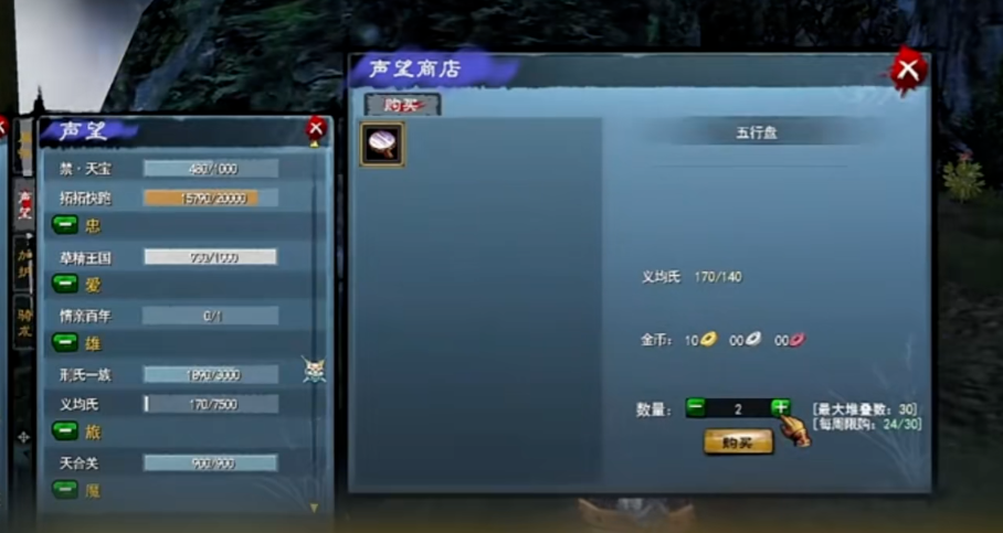 五行盘主要是通过义均氏声望兑换,做日常都会获得声望,新手玩家完成师门、诗与酒、拓拓快跑、同门弟子情四个日常任务后就能获得70点义均氏声望,用70点义均氏声望+5金币就能兑换五行盘,每周限购30个。