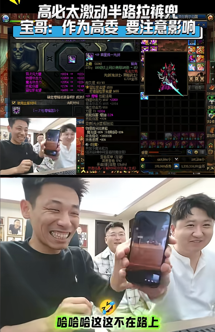 昨晚宝哥19武器成功增幅后,第一件事就是火急火燎地喊身边的兄弟高必来直播间见证。高必呢,激动得跟中了彩票似的,据他自己说,路上跑得太急,差点没憋住,险些“拉裤兜里”——这话一出,弹幕瞬间笑疯。问题是,高必压根不懂DNF,宝哥就逗他:“你觉得这武器值多少钱?”高必挠挠头,凭直觉报了个1500万。宝哥笑了,说少了少了,至少2500万起步,换算到梦幻西游里,能买两条150级愤怒+无级别腰带!高必一听,眼睛都直了,脱口而出:“那岂不是能直接换一条150级愤怒+晶清诀+无级别的腰带了?”宝哥赶紧摆手,笑着压低了一下:“哎,也没那么夸张,虽然这武器已经是顶级中的顶级了,但要说稀有度,还真比不上150级无级别+愤怒+晶清诀的腰带——那玩意儿,才是真正的神话。”一席话说得直播间水友纷纷刷屏:“宝哥清醒!”“理性消费!”