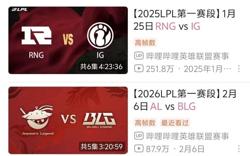不过这些,还不算是最直观的,比赛播放量数据下滑,才是最明显的,去年第一赛段,小破站播单场放量最高的,是IG打RNG,观看次数高达251万,今年第一赛段,最高的是BLG打AL,播放量仅有87.9万,整个第一赛段,没有一场比赛,是有超过百万的,热度下滑幅度只能说很夸张。