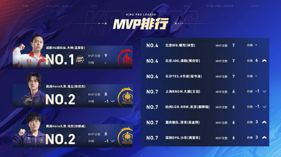 JDG清融v (黄垚钦)排名上升6名,累计获得7次MVP,与北京WB暖阳 (林恒)、长沙滔搏丶书源 (寇书源)并列第四。