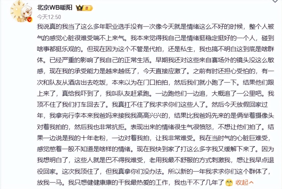 暖阳最后也是没办法了,直接长文怒怼了,也是求求这个私生饭文化快点消失,求求这个群体放过自己,更表示,让自己好好打比赛,打不了几年了的。