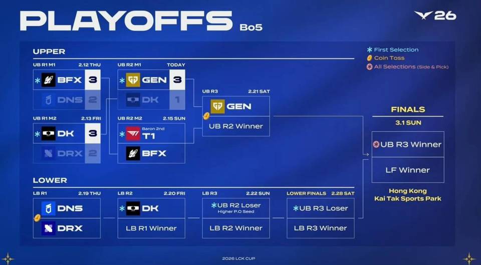 LCK赛区第一赛段淘汰赛,已经进行到第二轮了,在此前的比赛中,BFX和DK各自打满五局,晋级到季后赛六强,GEN作为常规赛第一,有优先选择对手的权利,教练组和选手们商议之后,选择了他们觉得,更好应对的DK,因此第二轮比赛上半区DK打GEN,下半区T1和BFX自动组队。