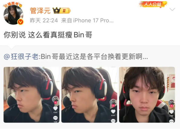 客观来看,两人气质与五官并不相同,但“恍惚之间像一下”的玩笑,恰恰说明粉丝对他的关注点已从操作延伸到外形,这类讨论之所以能发酵,一方面是Bin本身话题属性强,直率、敢说、带点少年气。