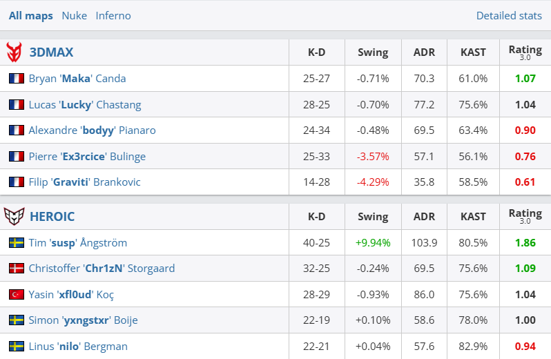 图一Nuke上HEROIC在进攻方平推对手,半场领先4分,换边更是一波5-1钢铁防守先下一城。图二Inferno,两队均是攻强守弱,尽管法国队上半场进攻拿到8分,但HEROIC下半场更是打出一波9-2攻势完成大逆转,法国队率先出局。