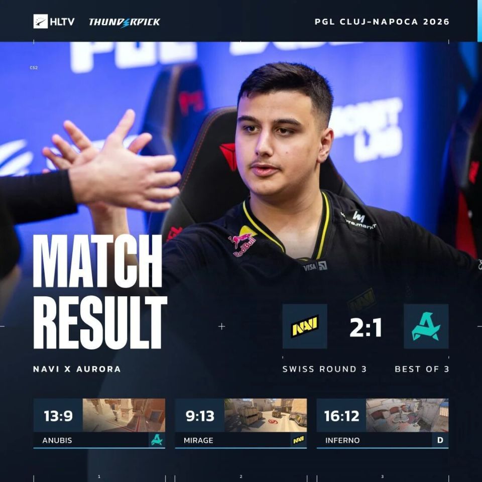 图一Anubis上半场NAVI虽落后两分,但换边赢下手枪局后连下7局,土耳其老将MAJ3R单图仅4杀,NAVI成功完成逆转。图二Mirage土耳其队构筑起钢铁防线,大B哥独木难支,Aurora还以颜色。决胜图Inferno两队战至白热化,NAVI在12-7先拿赛点下被Aurora连追5分进入加时。加时赛makazze、b1t发力,NAVI连下4局终结比赛。