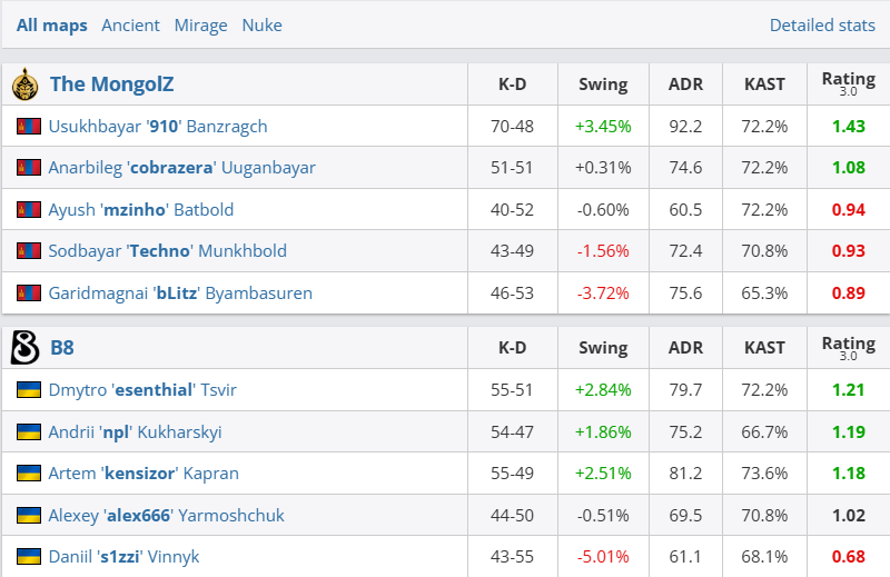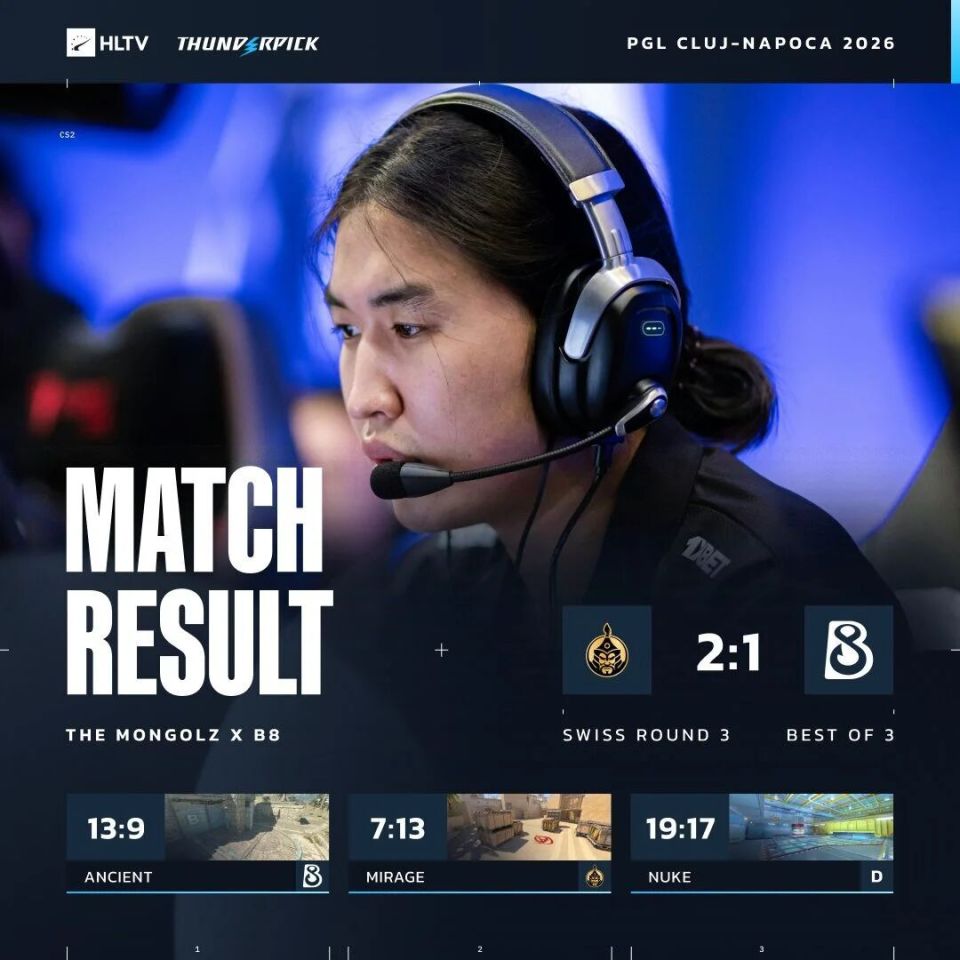 图一Ancient,MGLZ丢掉手枪局随即翻盘,以铁血防守半场9-3领先。虽然B8下半场顽强追至9-10,但910单图砍下21杀,蒙古队有惊无险拿下图一。图二Mirage,B8丢掉手枪局立马翻盘,更是以铁血防守连下11分。换边蒙古人虽连续追分,奈何上半场分拿少了,B8扳回一城。决胜图Nuke,蒙古队在防守方仅领先两分。换边在7-7后蒙古人打出一波5-2攻势先拿赛点,但B8也顽强追进加时。双方鏖战两个加时,910全程carry单图狂轰38杀助蒙古队笑到最后,B8濒临出局。