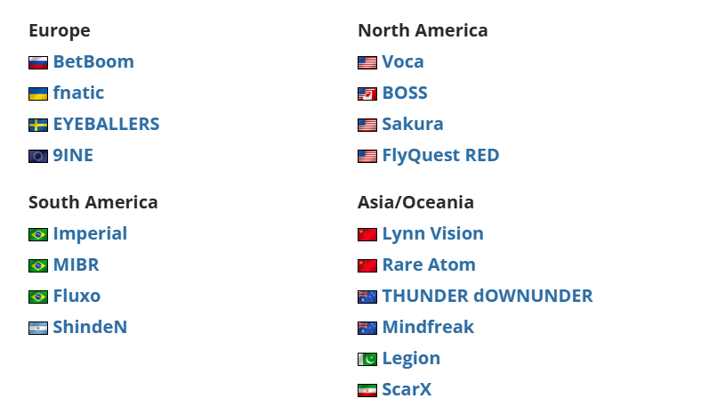 此外,四个地区预选赛的封闭预选赛受邀名单也已公布,其中欧洲区包括BB和EYEBALLERS,南美区包括MIBR和Imperial,亚太区包括LVG和RA。*每个赛区预选赛将有一个晋级正赛的名额。