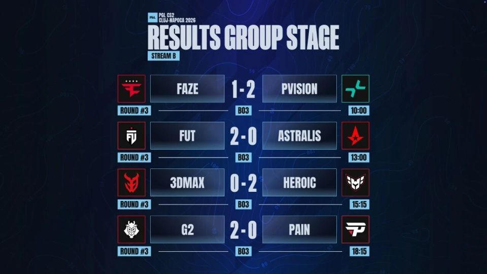 今天18:00起将继续第4日争夺,推荐MOUZ vs FUT(极致枪法)或FaZe vs A队(熟脸),MGLZ vs NAVI,FURIA vs PV这四场,欢迎届时收看。