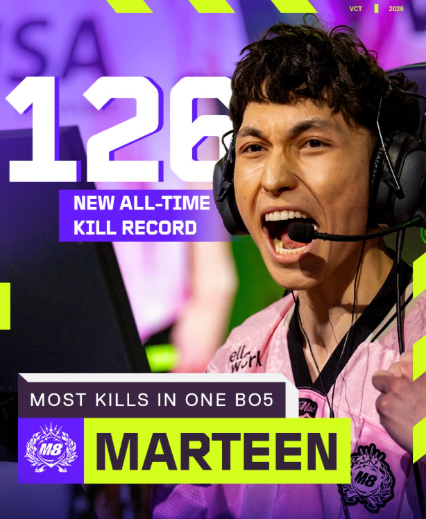 在早些时候落幕的《无畏契约》VCT EMEA启点赛中 ,VCT赛事的五局三胜制系列赛单场最高击杀纪录被刷新。M8战队的决斗者选手marteen成为了新的纪录保持者,他在VCT EMEA启点赛败者组决赛对阵FNC战队的比赛中,总计拿下126个击杀,帮助队伍赢得了胜利。他以惊人且极具影响力的稳定表现,不仅为队伍锁定了胜局,也助力M8成功晋级圣地亚哥大师赛。