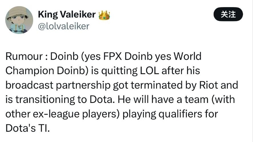 英雄联盟世界冠军中单Doinb,在去年宣布退役之后,就放弃LOL,把主战场转战到了DOTA上面,他的这波转型,可以说是非常成功,直播事业直接迎来了第二春,为了搞节目效果,Doinb还报名参加了不少比赛,6月份即将举行的TI国际邀请赛,Doinb也报名了,不过他得先打预选赛。