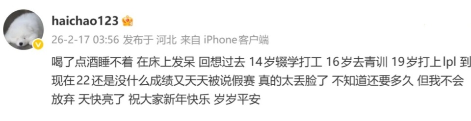 最近正值春节期间,OMG中单Haichao发布的一个微博是引起了大家的热议,Haichao是在大年初一的时候感叹自己的职业生涯,觉得很失败很丢脸,19岁打上LPL,打了几年之后还是没什么成绩还天天被说假赛。