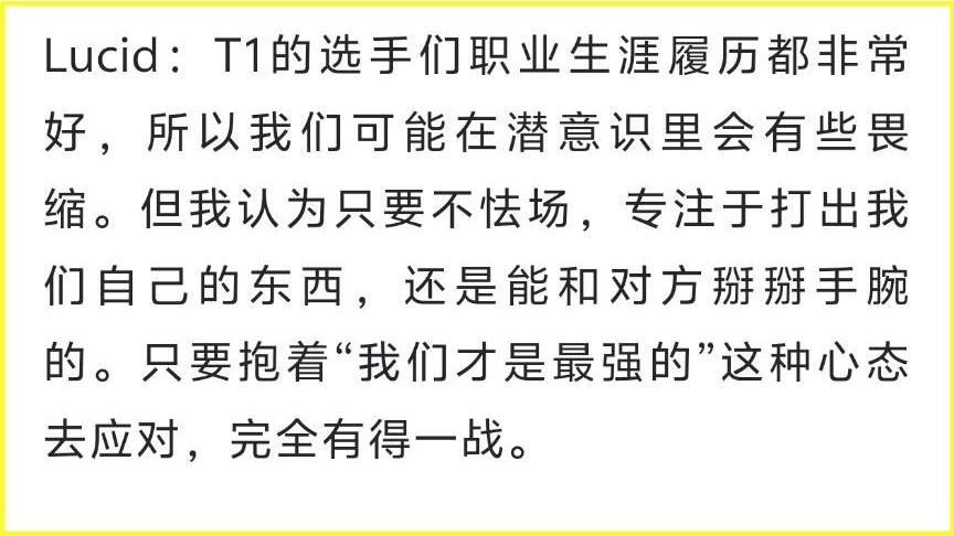 司马师想赢老东家,以此来证明自己,但队伍里有个人,却是未战先懦了,Lucid在采访中表示:T1的选手们职业生涯履历都非常好,所以我们潜意识里会有一些畏缩,不是哥儿们,比赛还没打自己就先害怕了吗?后续Lucid补充道:只要不怯场,打出自己的东西,还是能跟T1掰掰手腕。