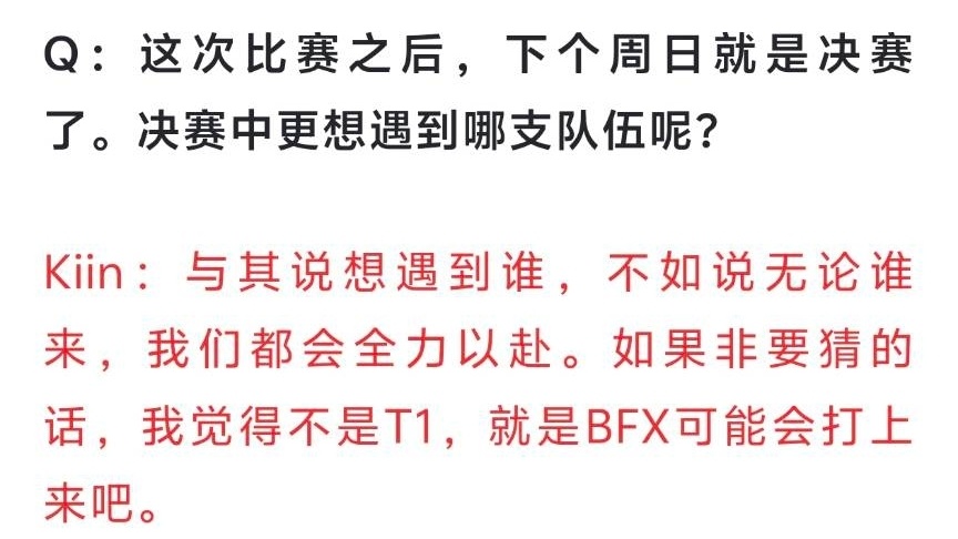 GEN上单Kiin,赛后接受专访时被提问:下周日的决赛,更想遇到哪支队伍?Kiin表示:谁来我们都会全力以赴,非要猜的话,不是T1就是BFX,许哥还没跟老李交手,就直接被Kiin无视了,看来现在只有串子们,才会觉得DK能赢T1了,客观点来说的话,DK赢T1的可能性,确实有点低。