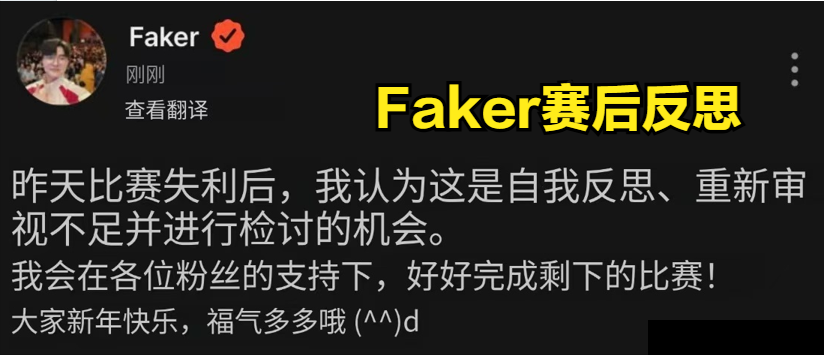 作为六冠王以及获得了S赛三连冠的Faker选手,在输给了BFX战队后,他进行了深刻的反思。Faker选手在社交媒体上发帖说道:“昨天比赛失利后,我认为这是自我反思、重新审视不足并进行检讨的机会。我会在各位粉丝的支持下,好好完成剩下的比赛!”