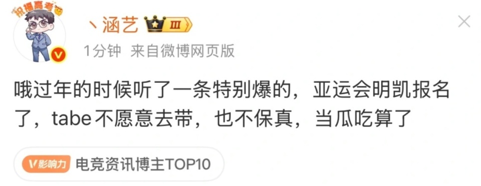 爆料人涵艺在最新的动态中爆料,亚运会国家队的教练岗位选拔中,EDG的厂长已经报名,而与此同时,大家公认能力比较强的国产教练Tabe似乎不愿意执教国家队,这个消息还挺让观众们意外的。