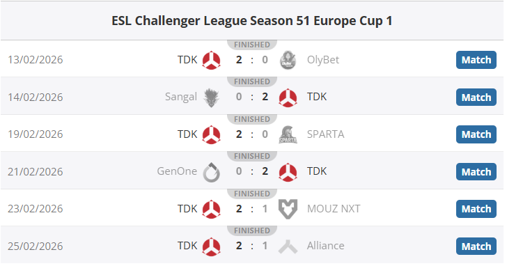 TDK目前还在进行另外两项线上赛事:NODWIN Clutch系列赛5(他们在瑞士轮小组赛中暂时取得2胜0负)和CCT欧洲系列赛16(目前已晋级四分之一决赛)。