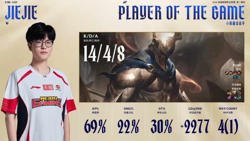 第一局MVP给到抢下龙魂的WBG打野Jiejie。