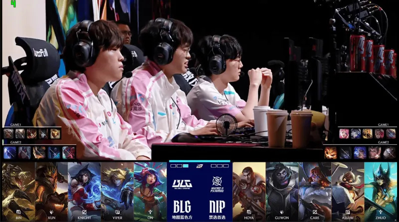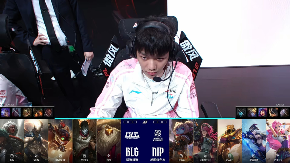 第一局比赛,BLG蓝色方,禁用:芸阿娜;韦鲁斯;鳄鱼;泰坦;卢锡安,选用:Bin狼母;Xun潘森;Knight炸弹人;Viper烬;ON巴德;NIP红色方,禁用:发条;兰博;妮蔻;伊泽瑞尔;卡莉斯塔,选用:HOYA波比;Guwon蔚;Care沙皇;Assum寒冰;Zhuo萨勒芬妮