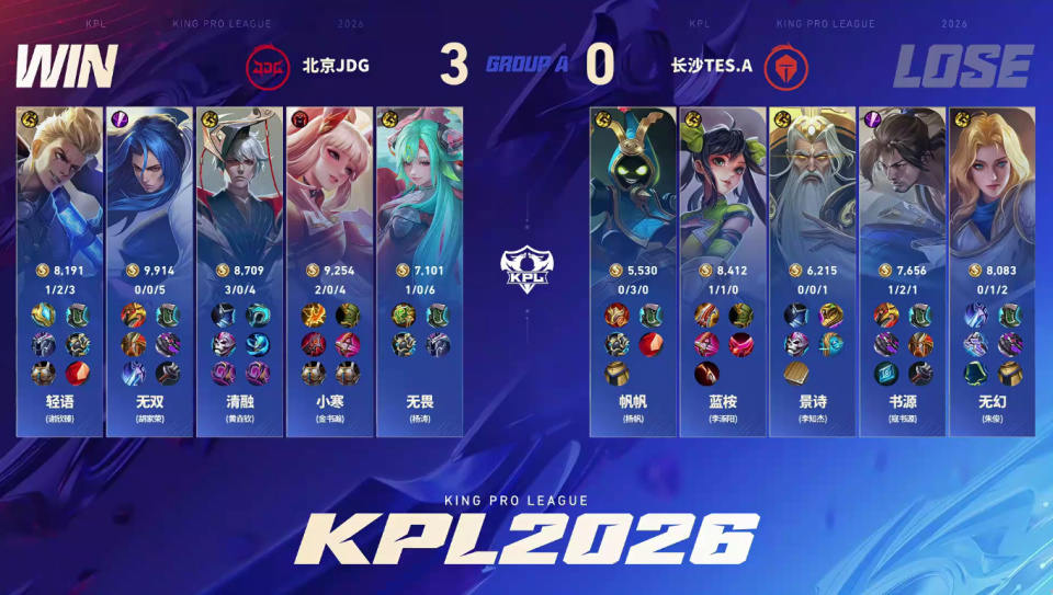 拿下这场比赛之后,JDG目前4胜0负,积4分,净胜分8分,积分高于TES、AG超玩会、WE、RW侠的理论最高积分,故JDG确认已超过A组4支战队,确认锁定2026年KPL春季赛常规赛第二轮S/A卡位赛。