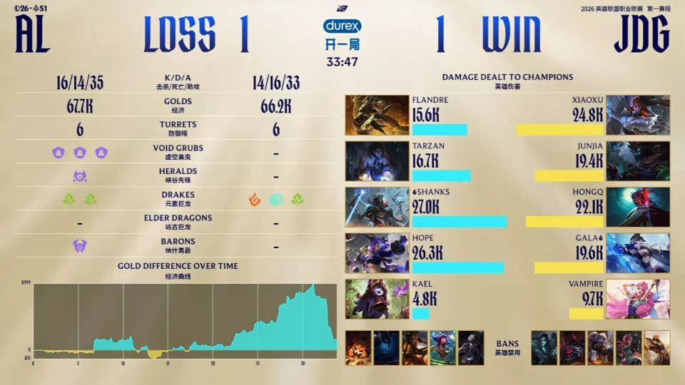 第一局比赛,AL蓝色方,禁用:妮蔻;发条;蔚;芸阿娜;希维尔,选用:Flandre雷克赛;Tarzan赵信;Shanks瑞兹;Hope韦鲁斯;Kael牛头;JDG红色方,禁用:波比;沙皇;皇子;巴德;狼母,选用:Xiaoxu兰博;JunJia潘森;HongQ岩雀;GALA烬;Vampire泰坦