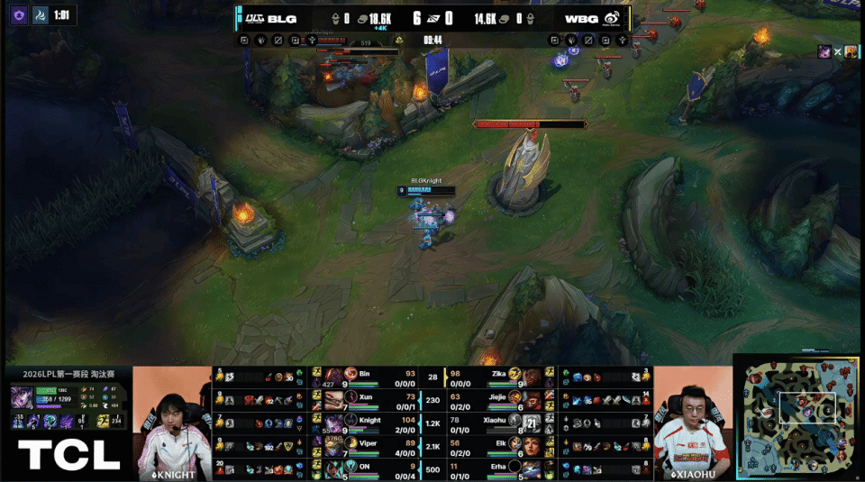 9分钟,Knight闲庭信步越塔单杀Xiaohu,BLG十分钟领先四千经济