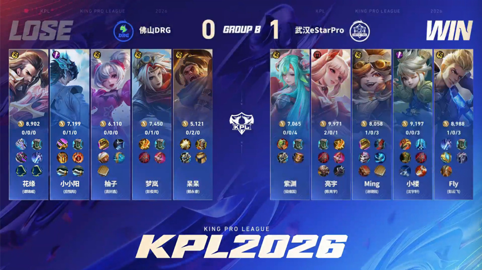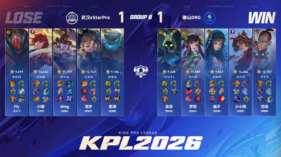 第一局eStar斗志昂扬的样子。在DRG红区,狂铁和大司命碰面,配合阿古朵打残了大司命,大司命开大坐到零个人,fly一闪拿下小小阳的一血。苏烈的位置也比较尴尬,没有队友能接应,eStar打出零换二。阿古朵体系拿到优势一路平推,一路平推,竟然打得DRG没有还手之力,12分钟出头就轻松拿下了。