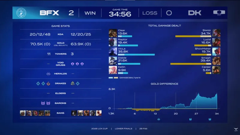 第二局比赛,BFX蓝色方,禁用:安蓓萨、波比、蔚、蛇女、奥拉夫,选用:Clear鳄鱼、Raptor巨魔、VicLa瑞兹、Diable艾希、Kellin萨勒芬妮;DK红色方,禁用:发条、潘森、兰博、蒙多、盲僧,选用:Siwoo阿萝拉、Lucid猴子、ShowMaker永恩、Smash炸弹人、Career泰坦