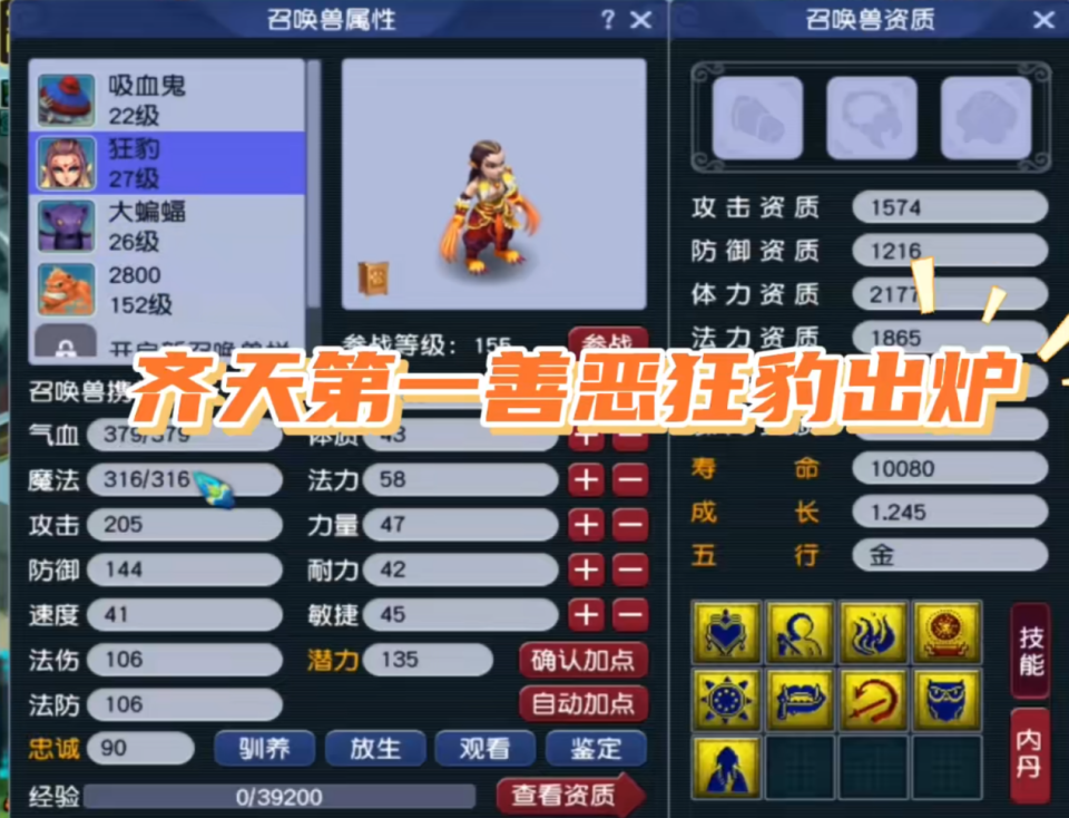 就在刚刚,齐天大圣主播铁锤上演极限操作!一发入魂直接炸出9技能善恶狂豹——攻击资质1574!成长1.245!这恐怖的面板数据直接让直播间炸穿!现在全网都在猜这头神宠最终会花落谁家?要我说,怕是又要被宝哥收入囊中了!
