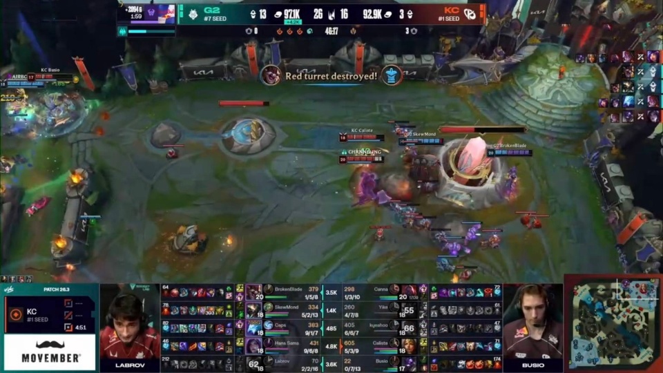 LEC赛区G2和KC争夺冠军,两队鏖战五局,最终G2赢下比赛,拿到冠军的同时,也晋级到了先锋赛,这两队的比赛,堪称“顶级小众变态比赛”,G2手握龙魂+远古龙+大龙,推平三路团战愣是打不过,KC眼看着要翻盘的时候,G2上野同时偷家,才得以终结比赛,两队都打得太过变态。