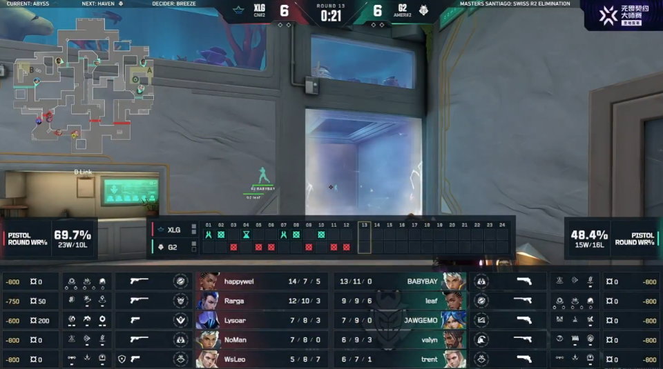 上半场XLG开局赢下手枪分拿到领先,G2随后在leaf的发挥下带队追平比分。