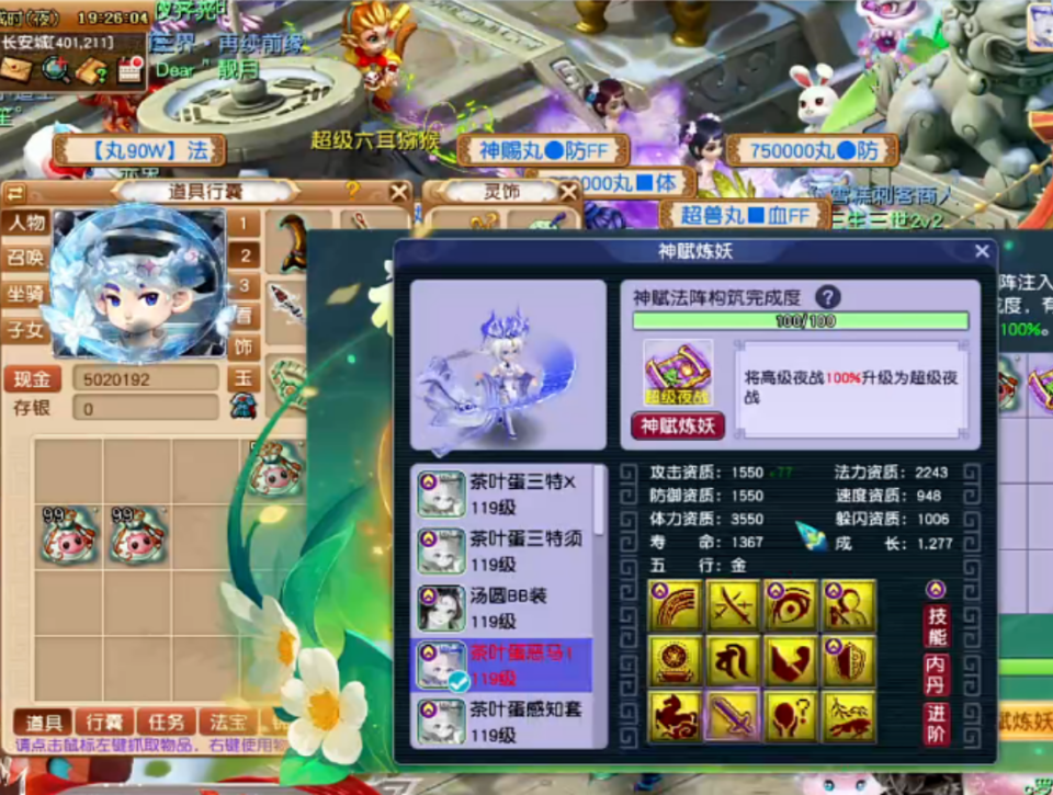 最近,【道法自然】战队的一位老板为了提升召唤兽强队,决定对一只12技能净台涂山瞳进行打书。老板花费大额成本准备了上千个神兜兜,为这只涂山瞳完成了100%法阵完成度,并用超级夜战兽诀覆盖了原有的高级技能。至此,这只涂山瞳不仅坐拥三大特殊技能,还有两本超级兽诀加持。面对普通的脆皮单位,有几率完成一刀斩杀,输出十分给力!