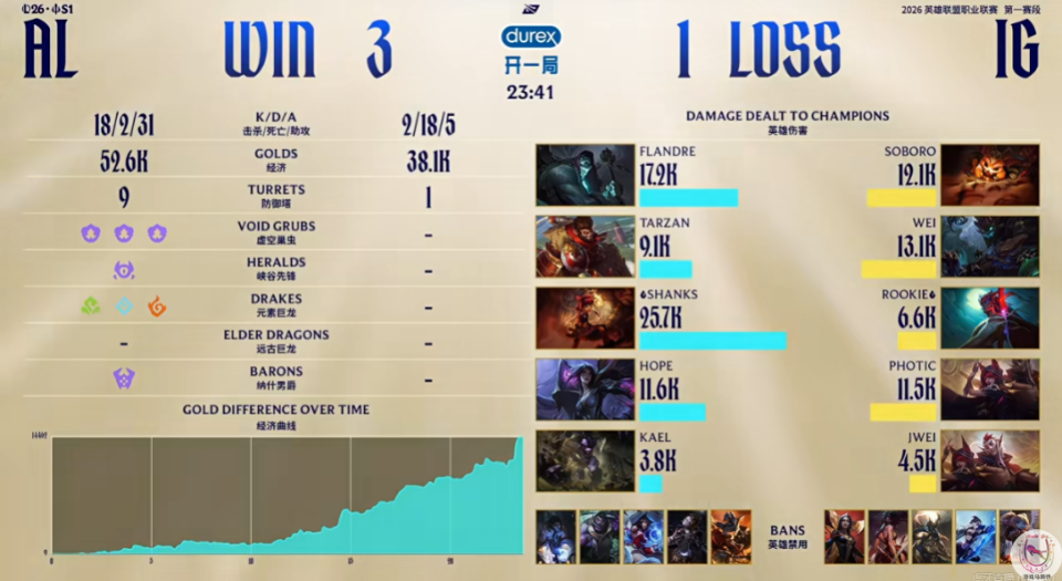 赛前大多数人自然都更看好AL可以轻松取胜,IG在赢下了一小局之后,AL没有再给任何机会,第四局甚至是打出了23分钟的速通碾压局。IG从赛季初德杯夺冠的小风光,到第一赛段最终还是止步五六名,这个结局倒也是符合他们今年不上不下的阵容配置。