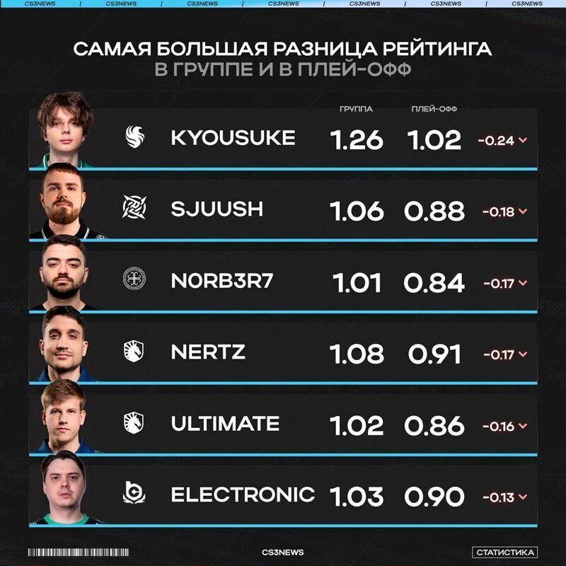 近日外媒CS3NEWS统计了从小组赛到淘汰赛数据下滑最严重的前五名选手。