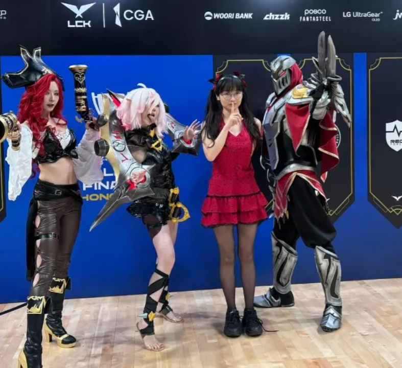 当天来到现场观赛的还有解说管泽元、主持人余霜以及选手YSKM,但不得不说,镜头和讨论热度却被这位“女版Faker”牢牢吸住,她与现场coser互动、合影留念,一举一动都在强化那种“真假难辨”的趣味感。