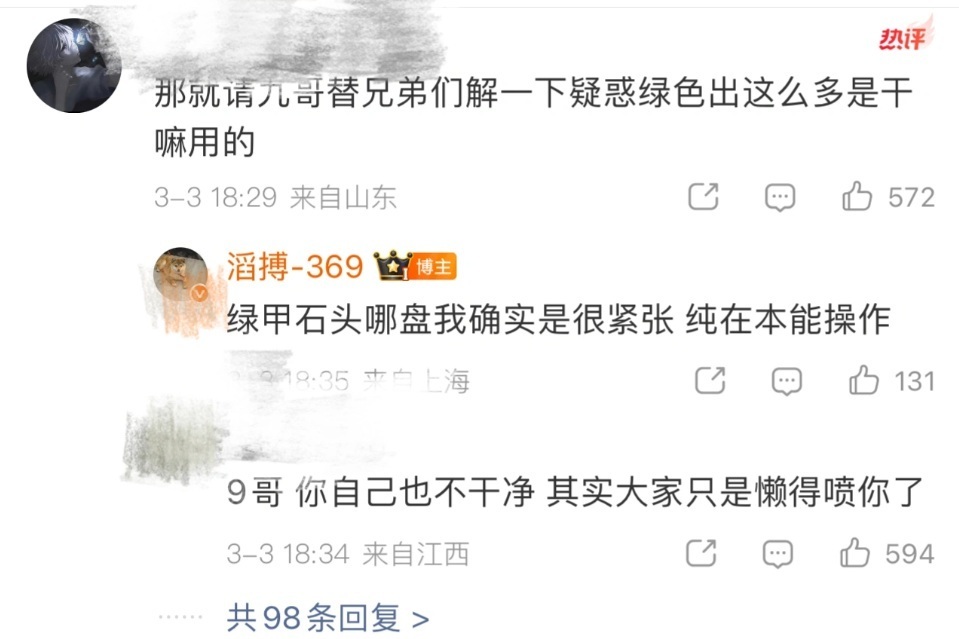 这个微博发布之后很快引发观众注意,短时间内有大量网友在下面发布评论,直接炮轰369,369也是在下面与网友高强度对线。