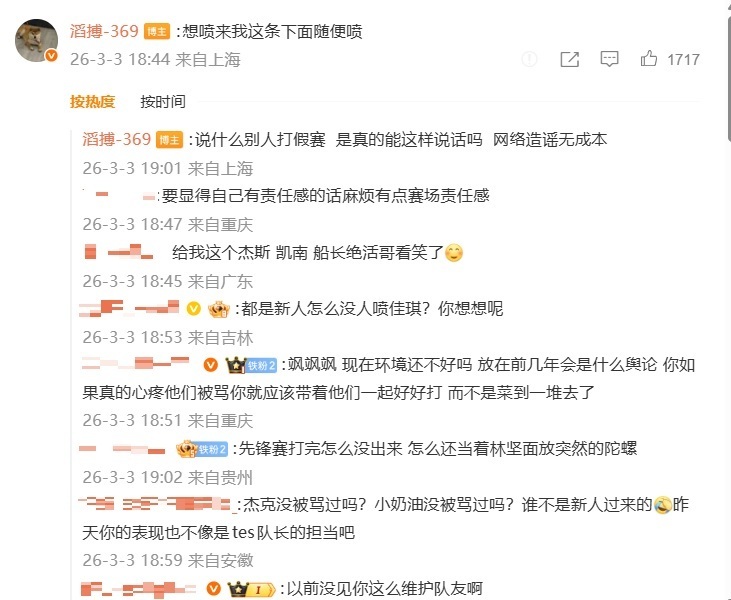 正当观众们讨论这个事情的时候,让人意想不到的事情发生了,TES上单369竟然下场发微博了,开始力挺自己的队友,直言对于观众们针对野辅的恶意评价实在看不下去了,总说LPL没有新人,这种舆论要新人怎么出成绩。